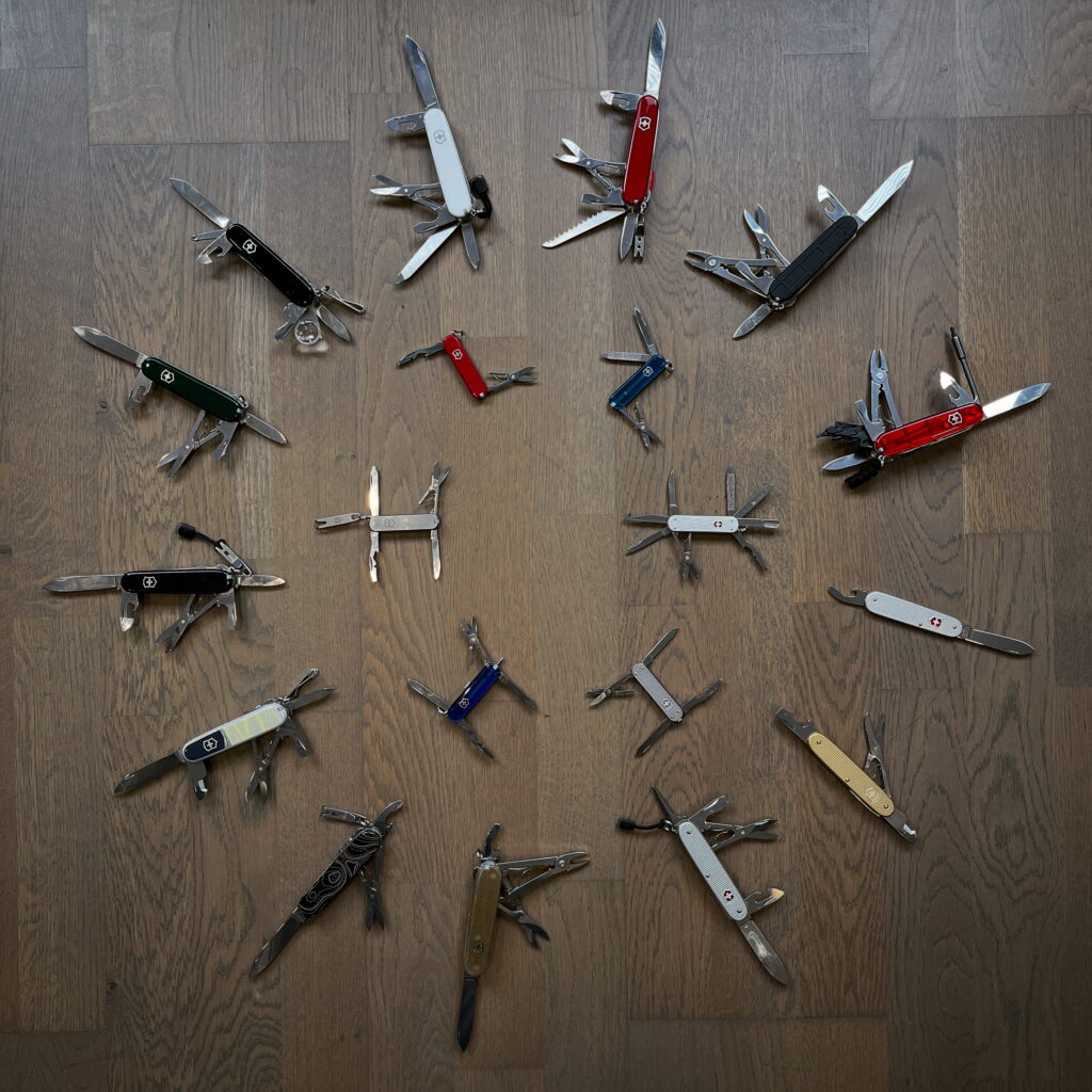 我一度以为这是维氏的经营策略——给每个型号都留一些瑕疵,永远不给你完美的产品,然而等我走到自组这一步,我才发现自组也做不到完美,设计一把瑞士军刀就是一个取舍的过程,要平衡工具的种类、位置、层数、重量,最终你只能保留最核心的需求,“既要又要”的结果就是变得又厚又重,失去了瑞刀的优雅和灵动,那还不如莱泽曼了。